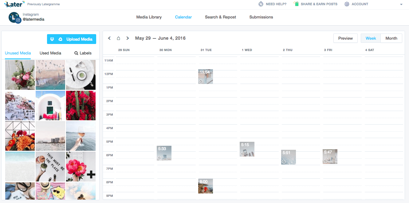 Once you have your final photos ready to go for Instagram, you can upload them to your media library with Later. Just drag and drop, or import a folder from your Dropbox or Google Drive, and all your photos for Instagram will be together in one place!